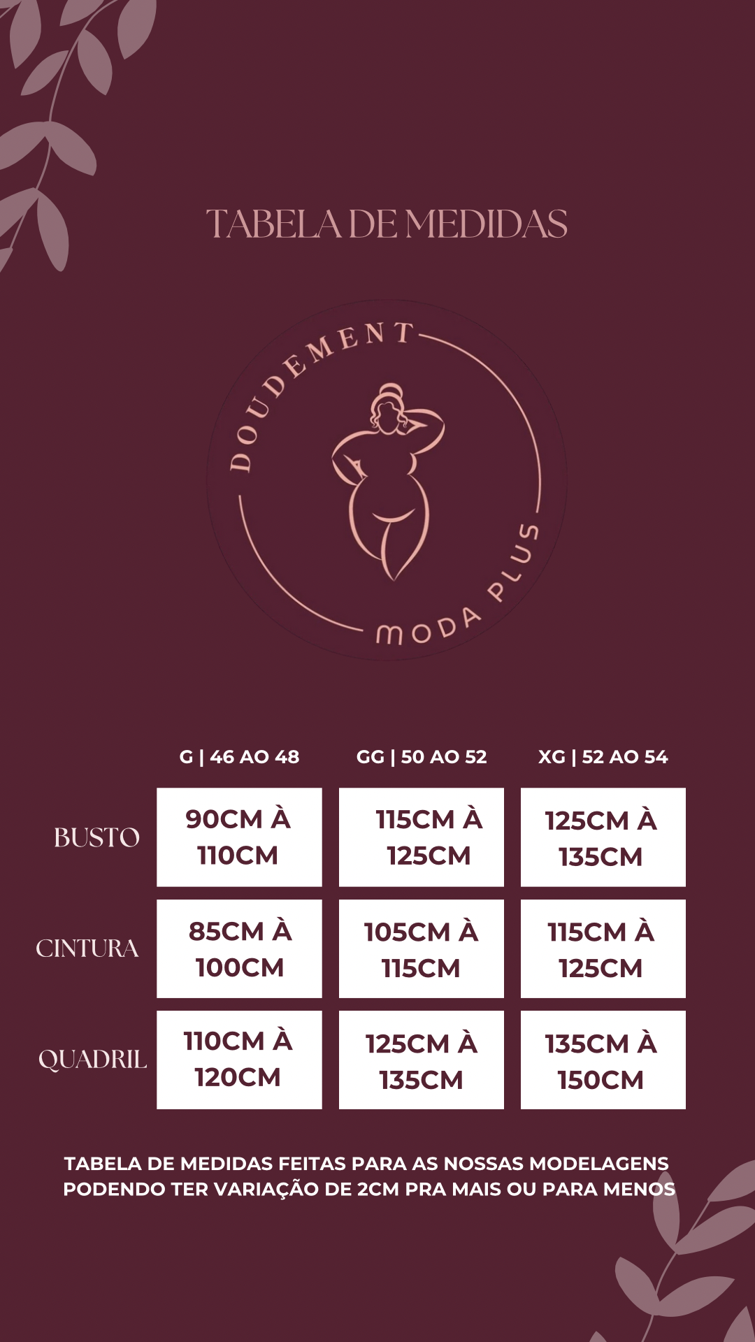 | Tamanho | Busto (cm) | Cintura (cm) | Quadril (cm) | |---------|------------|--------------|--------------| | 44 | 104-108 | 88-92 | 112-116 | | 46 | 108-112 | 92-96 | 116-120 | | 48 | 112-116 | 96-100 | 120-124 | | 50 | 116-120 | 100-104 | 124-128 |